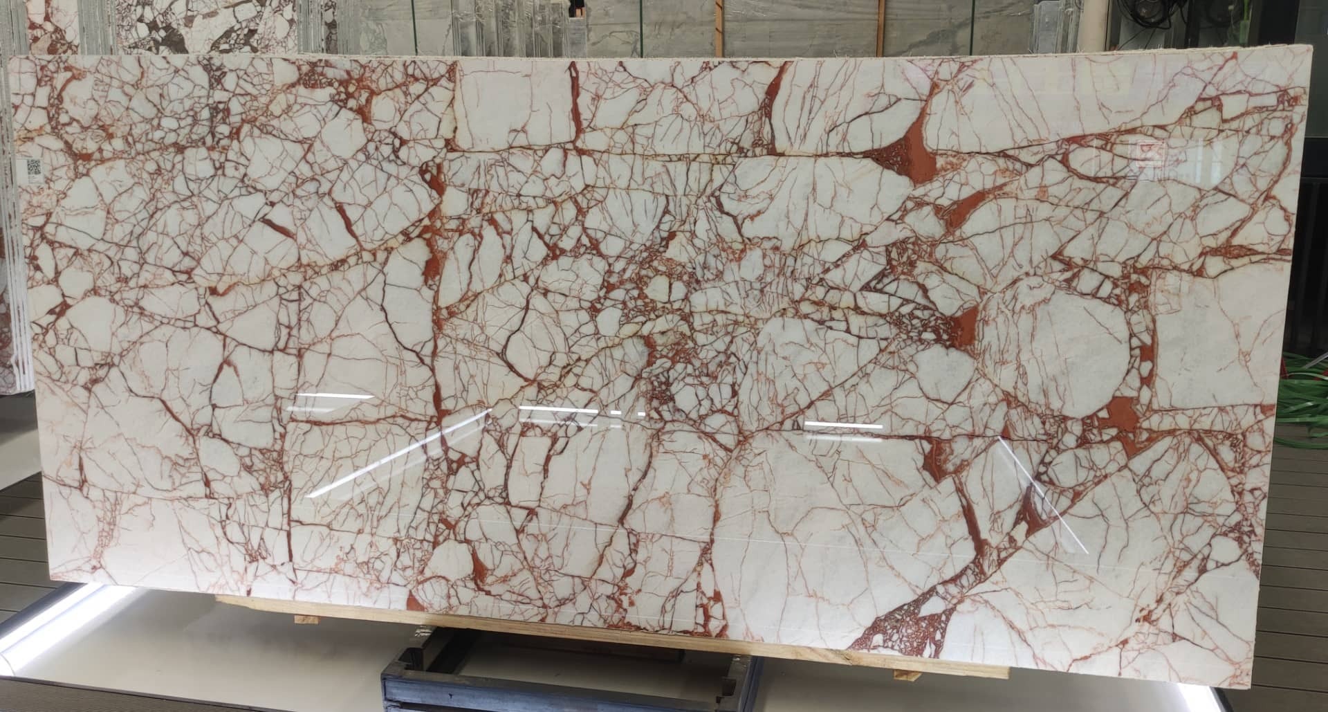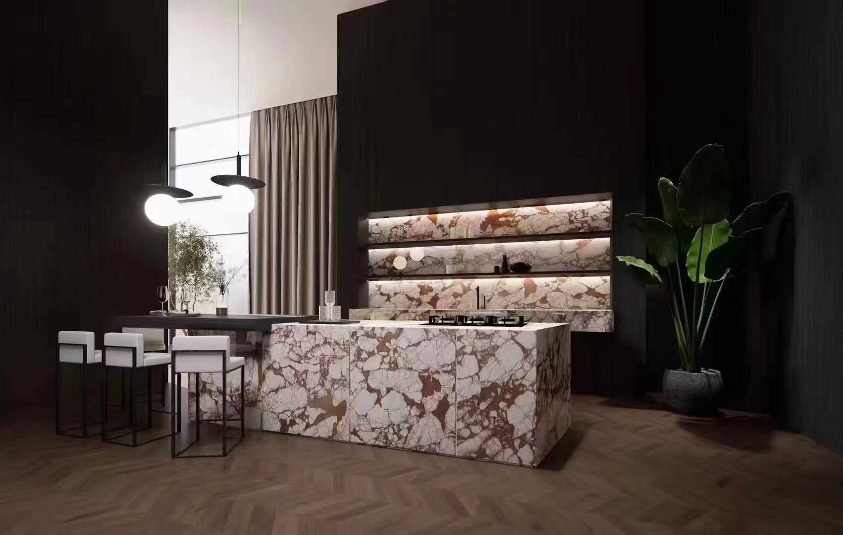 Bvlgari Red Marble, also known as Bvlgari Rosa, is distinguished by its soft pink background interlaced with delicate white veining. The stone conveys elegance and refinement, with a romantic hue reminiscent of fine jewelry. Its gentle yet luxurious tone makes it a perfect material for feature walls, flooring, bathroom countertops, and upscale interior decoration in hotels and villas, creating an atmosphere of warmth and sophistication.